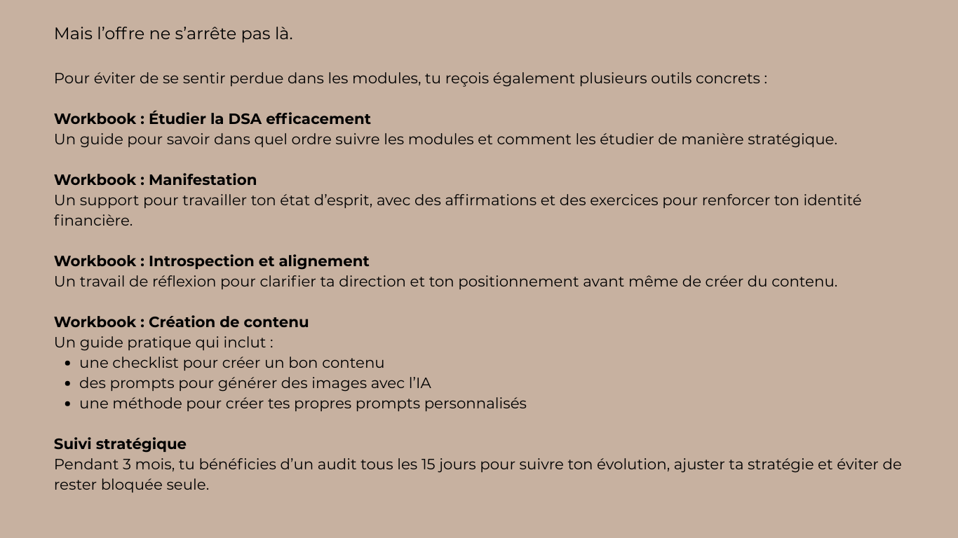 Elle s’adresse aux femmes ambitieuses qui ont déjà essayé de gagner de l’argent en ligne avec le MLM, affiliation ou autre mais qui ont l’impression que ça ne décolle pas pour elles.